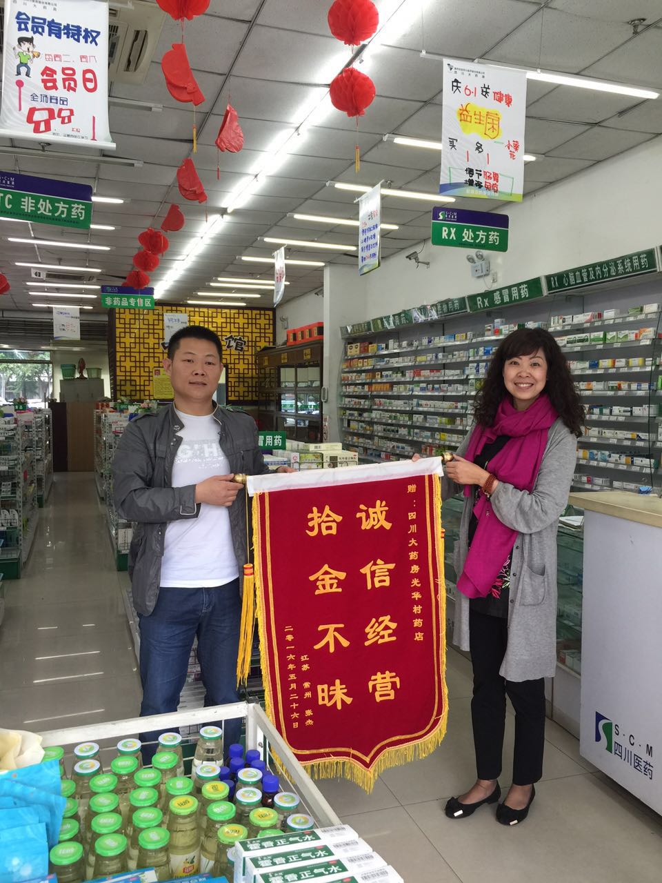 2016年5月27日上午,一面印着“诚信经营,拾金不昧”的锦旗送到了四川大药房光华村店。公司总经理冯艳及光华村店全体在岗员工受到了来者热情的感谢。