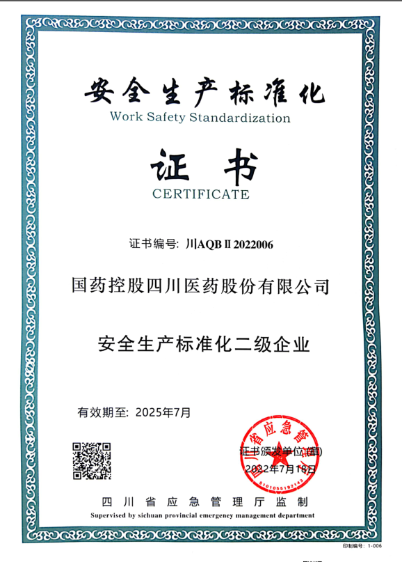 近日,国控四川近期顺利取得安全生产标准化二级企业证书。此次是公司自2015年初评取得证书以来,第二次完成复评工作,标志着安全生产标准化已在公司有效落地,持续运行,公司安全生产管理水平显著提高。
