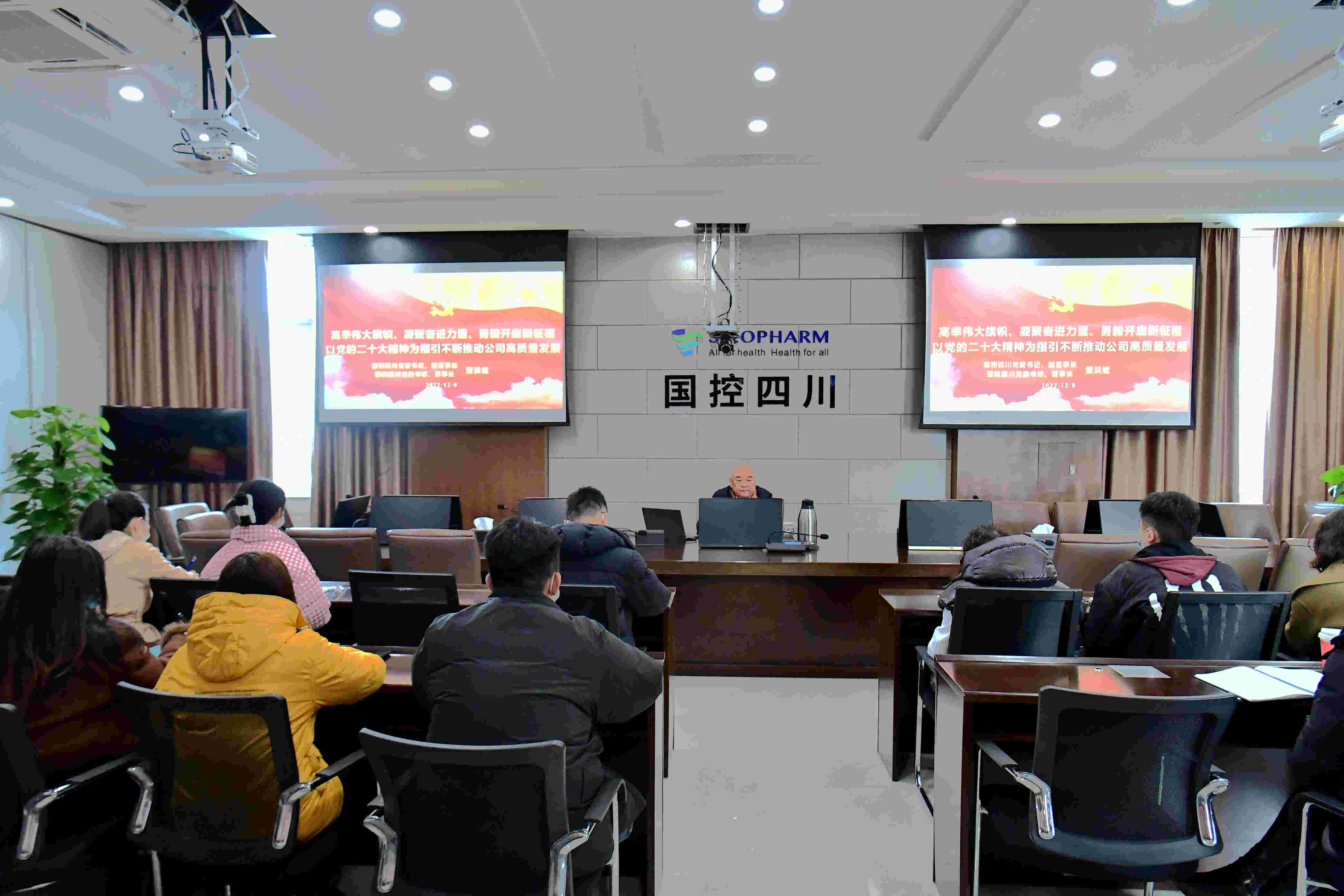 12月8日下午,国药四川党委书记、副董事长,国控四川党委书记、董事长贾洪斌在公司本部五楼会议室讲授学习宣传贯彻党的二十大精神专题党课。公司本部各党支部书记、支部委员、党员代表、团委书记、团委委员、团员青年代表现场参加党课学习。各子公司领导班子成员人员和党支部书记、支部委员、党员、团员青年等在所在办公地点通过视频参加党课学习。