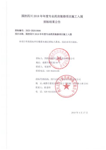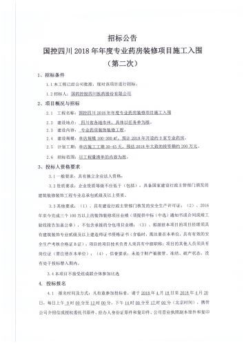 国控四川2018年年度专业药房装修施工入围招标结果公告及第二次招标公告
